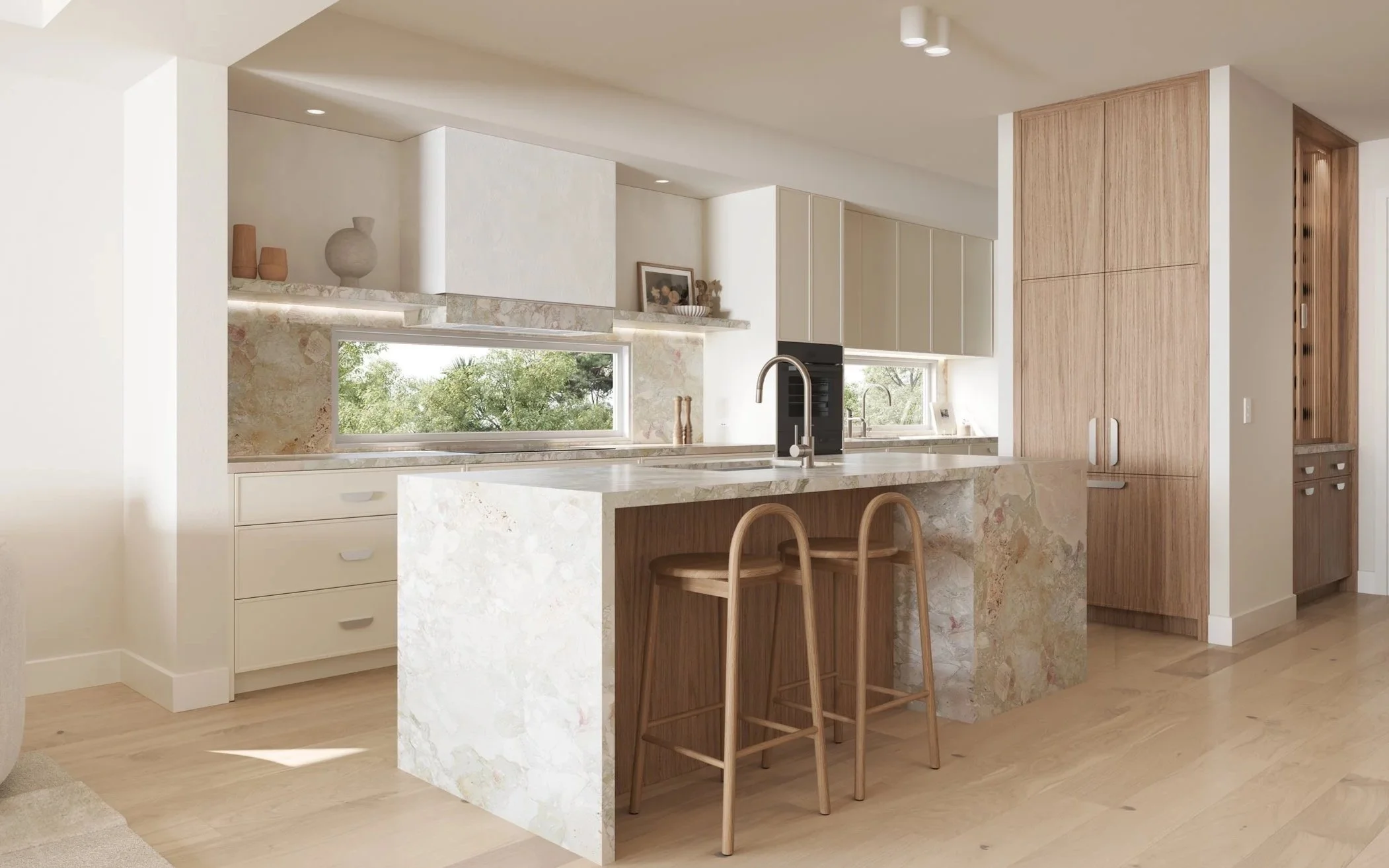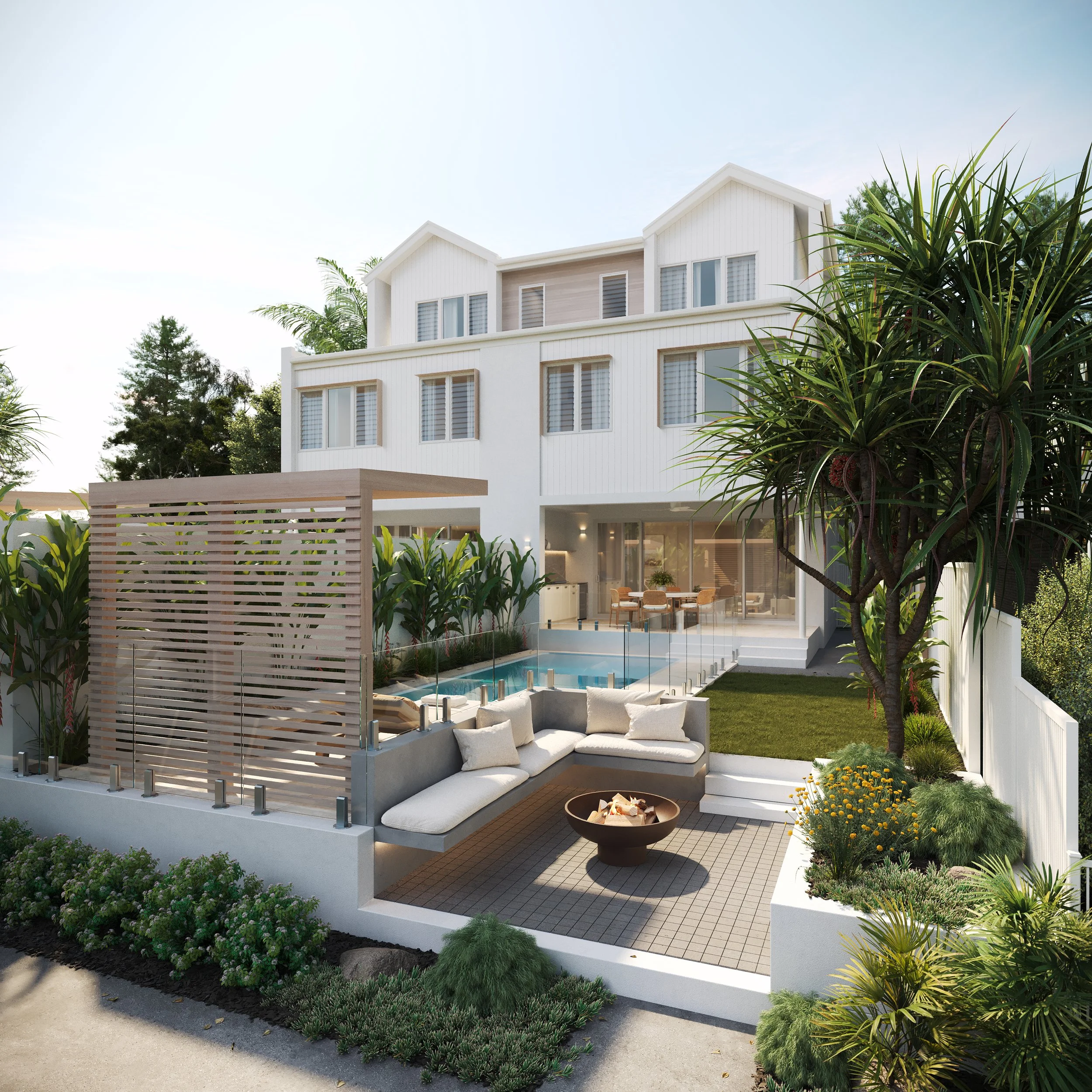 Spanning three levels and meticulously designed to honour its waterfront setting, each residence comprises four expansive bedrooms, four bathrooms, an internal lift and two distinct living areas. Arriving through a secure gatehouse framed by sculptural arbours, Oatland Residences balance privacy with presence. A self-contained guest suite with its own kitchenette opens directly to the private poolside terrace — a space equally suited to effortless entertaining or quiet retreat.